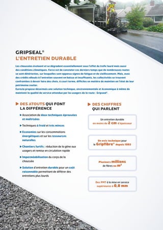 Le document présente le gripseal®, une solution technique pour l'entretien durable des chaussées, combinant un enduit superficiel d'usure et un matériau bitumineux coulé à froid. Cette technique améliore l'imperméabilisation et l'adhérence de la chaussée, réduisant ainsi les coûts d'entretien à long terme. Eurovia, qui maîtrise ce procédé, offre une alternative efficace face à la dégradation des routes causée par le trafic et les conditions climatiques.