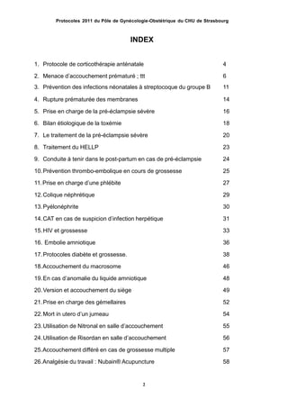 Le document présente les protocoles d'obstétrique de 2011 du pôle de gynécologie-obstétrique du CHU de Strasbourg, comprised ainsi de divers traitements et prises en charge pour des situations telles que la menace d'accouchement prématuré, la pré-éclampsie sévère, et la prévention des infections néonatales. Il inclut des instructions détaillées sur l'utilisation de médicaments tels que la corticothérapie anténatale et les tocolytiques, ainsi que des protocoles spécifiques pour des complications comme les métrorragies et la rupture prématurée des membranes. Ce document sert de guide pour les professionnels de santé dans la gestion des soins obstétriques.