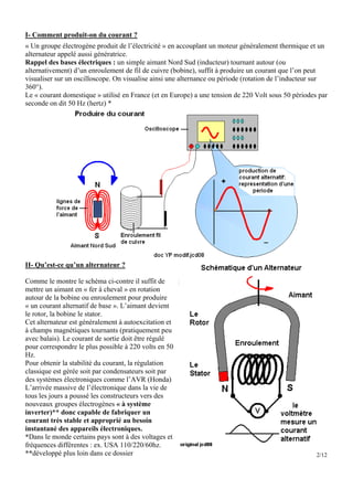 Le document présente le fonctionnement des groupes électrogènes, composés d'un moteur thermique et d'une génératrice, qui produisent de l'électricité en convertissant l'énergie mécanique en énergie électrique. Il explique également les différences entre les groupes électrogènes domestiques et semi-industriels, ainsi que les technologies de régulation, y compris l'utilisation de systèmes inverter pour un courant plus stable adapté aux appareils électroniques. Enfin, le texte aborde l'importance de la maintenance et des spécifications techniques pour assurer le bon fonctionnement et la sécurité des groupes électrogènes.