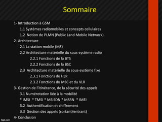 Le document présente une analyse détaillée du réseau GSM, un standard de téléphonie mobile de seconde génération (2G) qui a été introduit en 1991. Il aborde l'architecture du système, la gestion de la mobilité et la sécurité des communications, ainsi que les mécanismes de numérotation associés. Malgré des débits limités, le GSM demeure la norme la plus largement adoptée dans le domaine des réseaux mobiles.