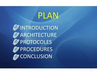 Le document traite des protocoles et procédures du système GSM, décrivant son architecture en trois sous-systèmes : le BSS (sous-système radio), le NSS (sous-système d'acheminement) et l'OSS (sous-système d'exploitation et de maintenance). Il détaille les composants essentiels de chaque sous-système, tels que les stations de base et les centres de commutation, ainsi que les protocoles de signalisation impliqués à travers différentes couches. En outre, il aborde les interfaces reliant les sous-systèmes et les différentes procédures de gestion des connexions et de la mobilité des usagers.