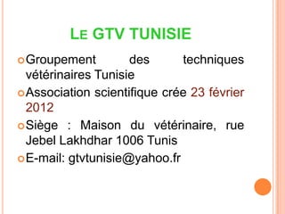 Le Groupement Technique Vétérinaire de Tunisie, créé en 2012, se consacre à la formation continue et au développement des compétences en techniques vétérinaires au travers d'activités scientifiques et de partenariats internationaux. Il est structuré en un comité directeur et plusieurs commissions, visant à promouvoir la médecine vétérinaire et à améliorer les productions animales. En 2013, le GTV prévoit des formations et le premier congrès sur la prestation vétérinaire, tout en incitant à l'adhésion via un processus défini.