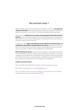 L'association Acte est un atelier citoyen dédié à la transition écologique dans le 3ème arrondissement de Paris, favorisant la mobilisation locale pour un développement durable. Ce document répertorie des solutions d'approvisionnement alimentaire en bio ou en circuit court, tout en présentant divers labels et initiatives visant à améliorer la qualité des aliments tout en respectant l'environnement. L'association encourage la démocratie participative et la solidarité entre consommateurs et producteurs à travers des pratiques d'agriculture durable.