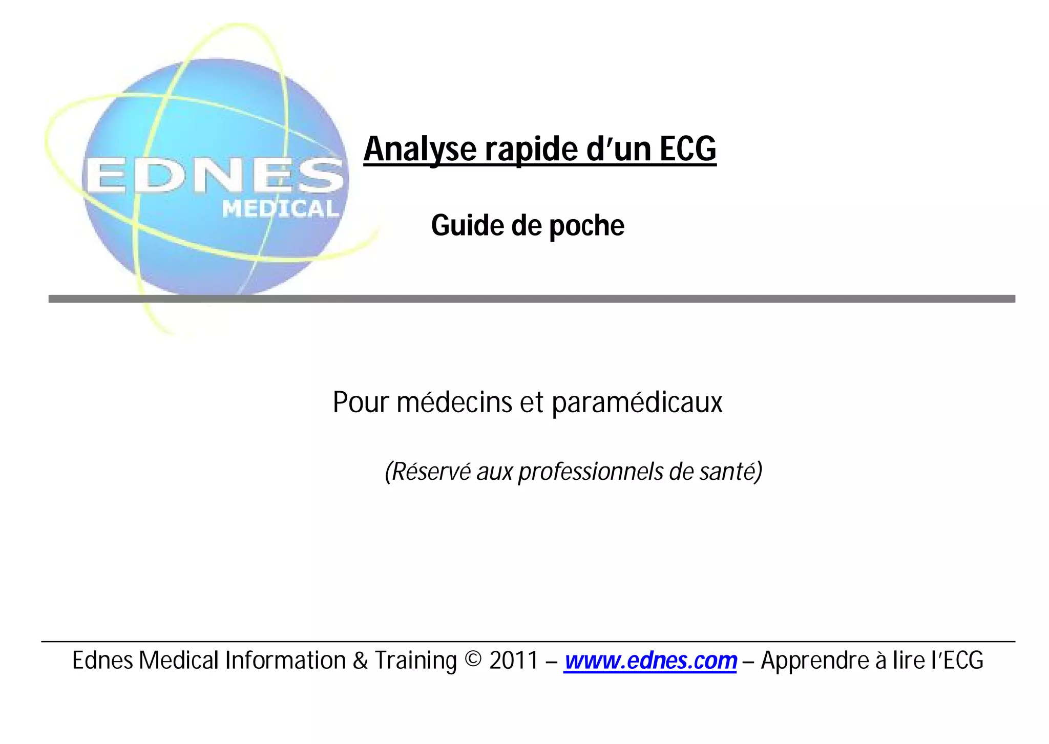 Ce guide de poche fournit des informations essentielles sur l'analyse de l'ECG, destiné aux professionnels de santé ayant une formation préalable. Il aborde des concepts fondamentaux tels que la fréquence cardiaque, les rythmes cardiaques et les méthodes de mesure de l'axe de dépolarisation. Également, il met l'accent sur l'importance d'une bonne qualité d'enregistrement pour une interprétation précise.