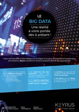 Le guide du big data 2015/2016 présente l'évolution et les implications du big data, qui s'affirme comme un marché en croissance de 30% par an, soutenu par des applications diversifiées et l'Internet des objets. Le document souligne que les secteurs de la finance, de la santé et du secteur public sont en tête, promettant d'importants gains économiques en intégrant le big data, malgré des défis liés aux compétences et aux coûts. Enfin, il évoque l'importance de la simplification et de la démocratisation des solutions cloud pour surmonter les obstacles à l'adoption du big data dans les entreprises.