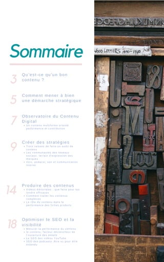 Le document présente des conseils et réflexions sur la production de contenu à valeur ajoutée, soulignant l'importance d'une stratégie cohérente et multiforme. Il explore les défis liés à la création de contenu adapté au support et à l'audience, tout en insistant sur la nécessité d'audits réguliers pour optimiser la performance et la visibilité. Enfin, il aborde le rôle croissant des podcasts et du contenu audio dans la communication interne et le marketing.