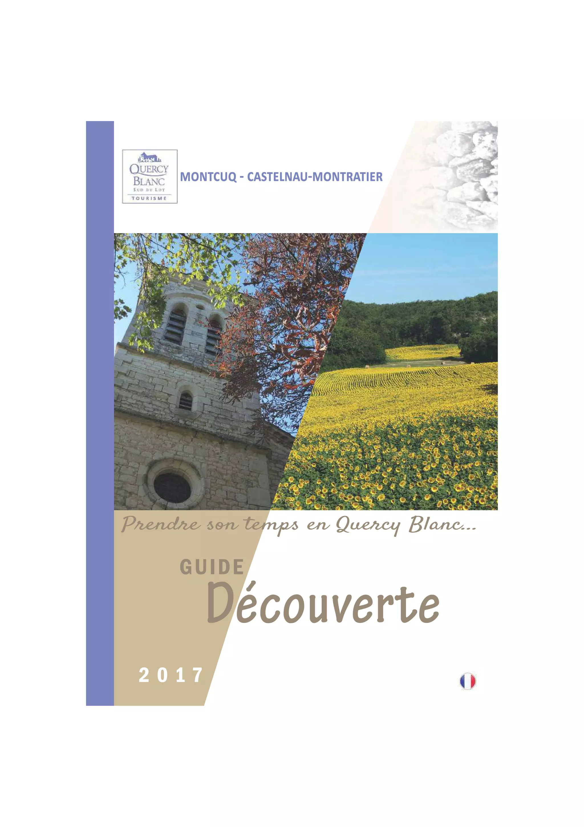 Le guide décrit le Quercy Blanc, un territoire riche en patrimoine culturel, naturel et artisanal, ainsi que les activités et événements qui s'y déroulent. Il mentionne des sites historiques, des chemins de pèlerinage, ainsi que des manifestations locales comme des marchés et des festivals. Le document propose également des informations sur les services et loisirs disponibles pour les visiteurs et les habitants.