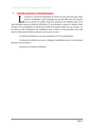 Ce document présente une vue d'ensemble sur les bassins de rétention, leur fonctionnement, leurs types (secs, en eau, et infiltration) et les contraintes de conception nécessaires. Les bassins de rétention jouent un rôle essentiel dans la gestion des eaux pluviales pour prévenir les inondations, et leur conception doit tenir compte de plusieurs facteurs techniques comme l'hydrologie et l'hydraulique. Les recommandations incluent des considérations pour l'étanchéité, l'accès pour l'entretien et la protection des talus.