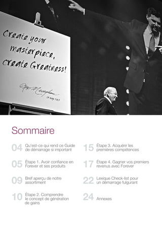 Le guide de démarrage de Forever Business Academy présente un plan étape par étape pour réussir en tant que propriétaire d'entreprise Forever, une société leader dans le secteur de l'aloe vera. Le document souligne l'importance de la confiance en l'entreprise et ses produits, ainsi que la génération de revenus via un réseau de bouche-à-oreille. Il met également en avant l'opportunité de travailler de manière flexible tout en contribuant au bien-être des autres avec des produits de santé de qualité.