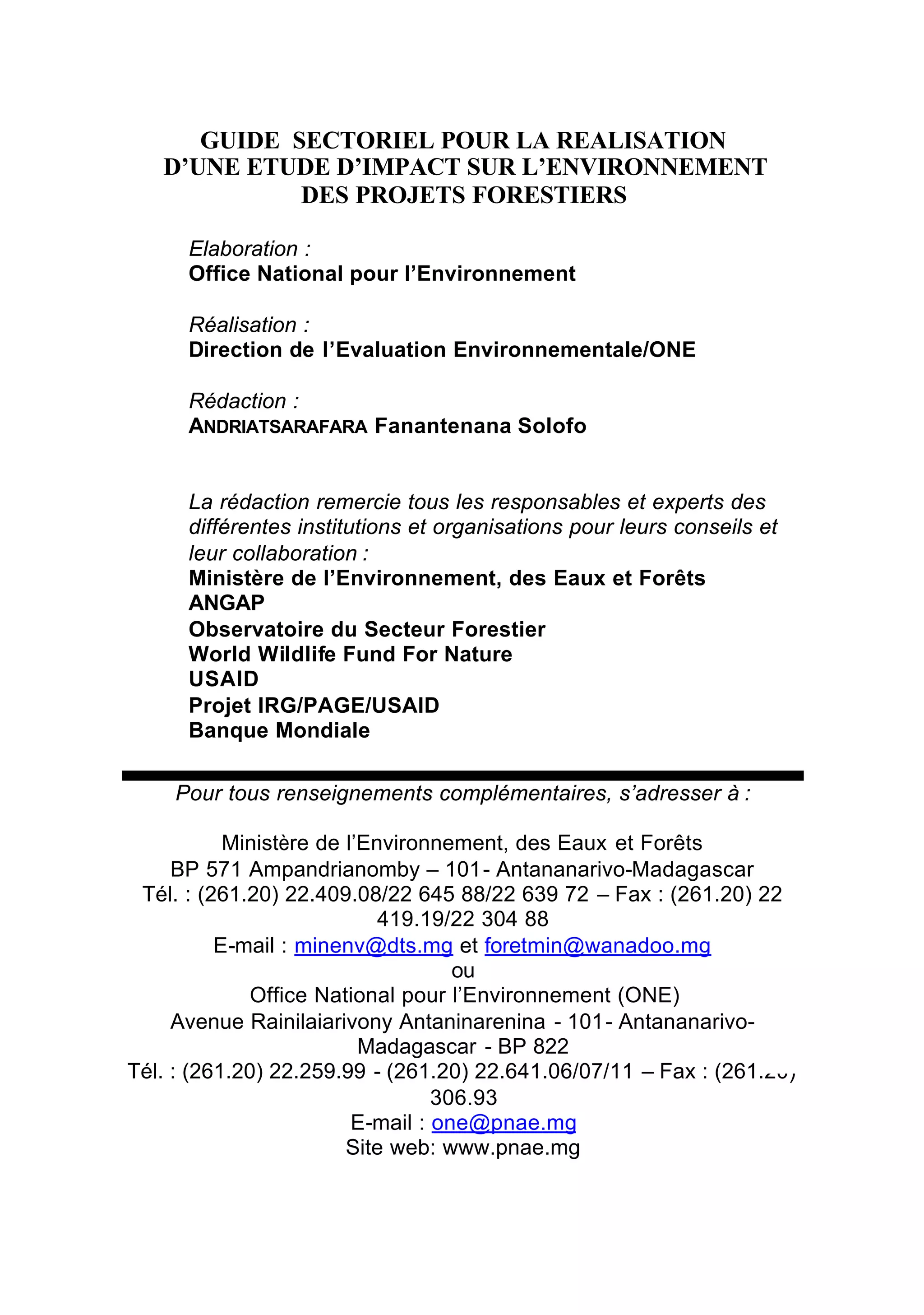 Ce document est un guide sectoriel pour la réalisation d'études d'impact sur l'environnement des projets forestiers à Madagascar, élaboré par l'Office National pour l'Environnement. Il détaille les termes de référence, les exigences pour les projets forestiers, ainsi que les impacts environnementaux potentiels et les mesures d'atténuation nécessaires. L'objectif est de fournir un canevas général pour les promoteurs de projets afin d'assurer une évaluation environnementale conforme aux législations en vigueur.