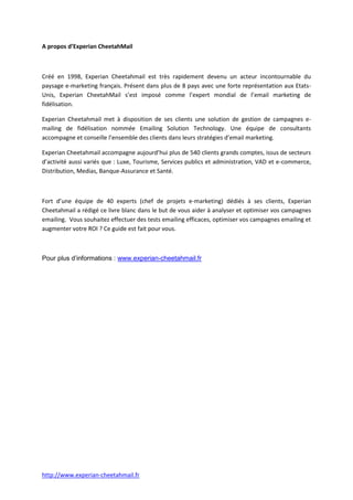 Le guide d'Experian CheetahMail fournit des bonnes pratiques pour l'optimisation des campagnes emailing à travers des tests méthodiques. Malgré leur efficacité prouvée, de nombreux marketers négligent de réaliser des tests, ce qui peut entraîner des pertes d'opportunités. Le document propose des conseils sur la mise en place de tests à court et long terme, ainsi que des exemples pratiques pour améliorer les performances des campagnes emailing.