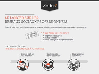 Le document est un guide sur le networking professionnel destiné aux étudiants, présentant quatre usages des réseaux sociaux professionnels tels que contrôler sa présence en ligne, rester en contact, rechercher des offres d'emploi et recevoir des contacts de recruteurs. Il met également en avant cinq pièges à éviter sur ces plateformes. Viadeo est mentionné comme le premier réseau social professionnel au Maroc.
