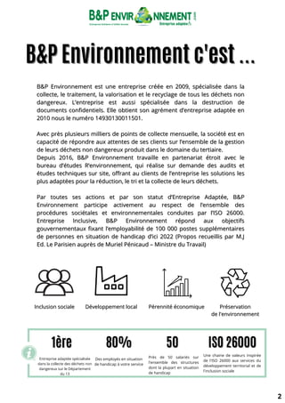 B&P Environnement, créée en 2009, est spécialisée dans la collecte, le traitement et le recyclage des déchets non dangereux, ainsi que la destruction de documents confidentiels, tout en étant une entreprise adaptée employant des personnes en situation de handicap. Elle travaille en collaboration avec le bureau d'études R'Environnement pour optimiser le tri et la gestion des déchets de ses clients, en conformité avec les normes ISO 26000. L'entreprise contribue activement aux objectifs gouvernementaux d'employabilité et à la sensibilisation à la réduction des déchets sur les sites d'état.