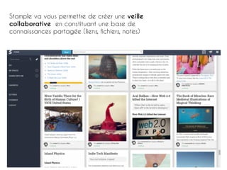 Stample permet de créer une veille collaborative en rassemblant une base de connaissances partagée contenant des liens, fichiers et notes. L'utilisateur doit s'inscrire, installer le clipper web, et peut ensuite collecter et organiser du contenu digital. En outre, il est possible d'écrire des notes, importer des documents, ajouter des commentaires et partager des informations dans un espace commun.