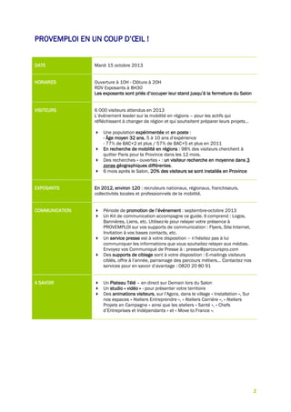 Le salon Provemploi 2013 se tiendra le 15 octobre à Paris, réunissant environ 6 000 visiteurs en quête de mobilité en région. Les exposants, dont des recruteurs et collectivités, doivent se préparer minutieusement en suivant un agenda précis, avec des informations sur la logistique, la sécurité et la communication. Des réductions sont disponibles pour les déplacements, et des animations ainsi qu'un service presse accompagneront l'événement.