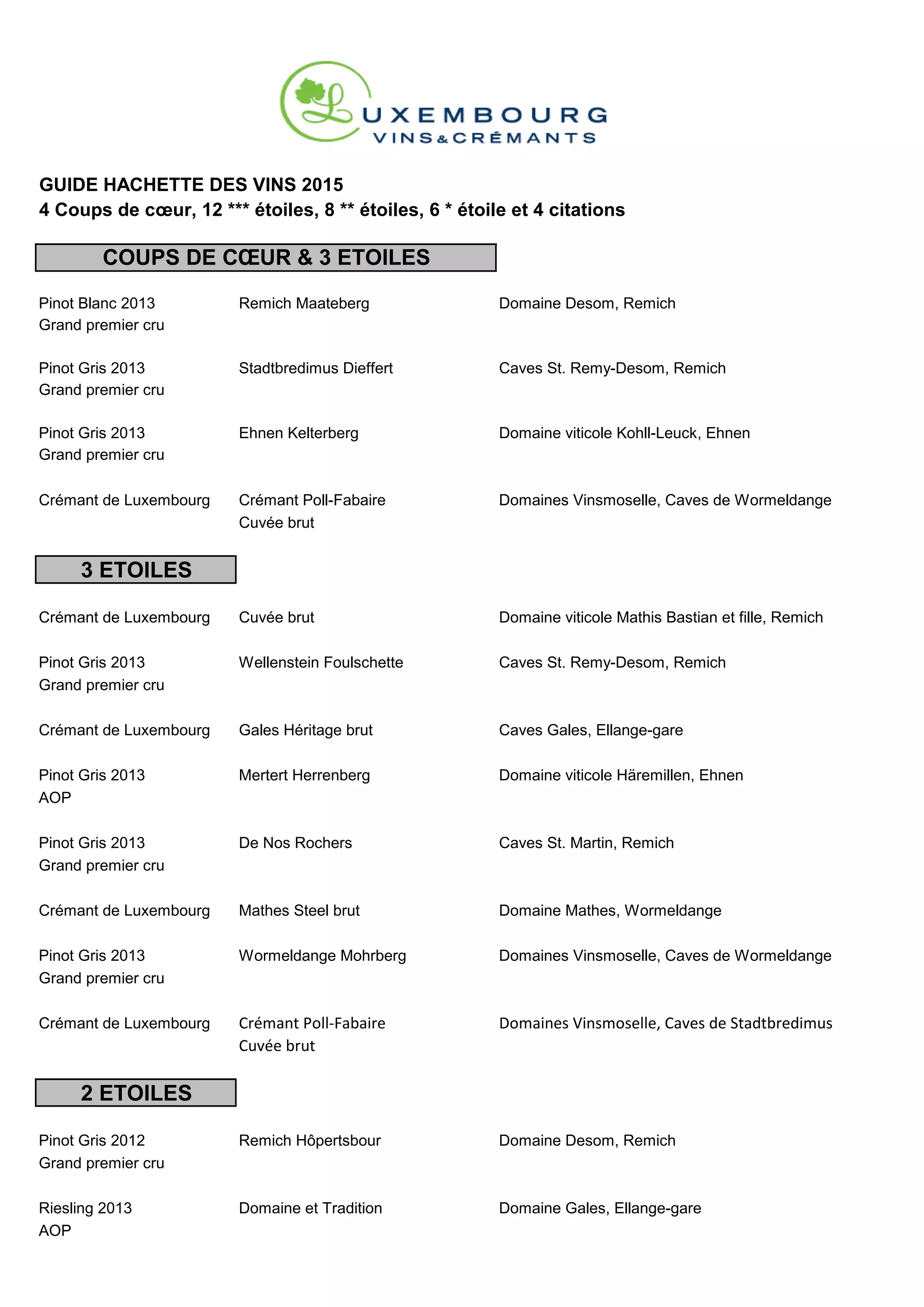 Le document est un guide sur les vins de l'édition 2015, présentant des coups de cœur et des classements par étoiles pour divers cépages et crus, en se concentrant principalement sur les vins du Luxembourg. Il inclut des annotations pour des vins spécifiques comme le pinot gris et le riesling, ainsi que des recommandations de domaines viticoles. Cet aperçu met en avant les meilleures sélections et la qualité des produits viticoles de la région.