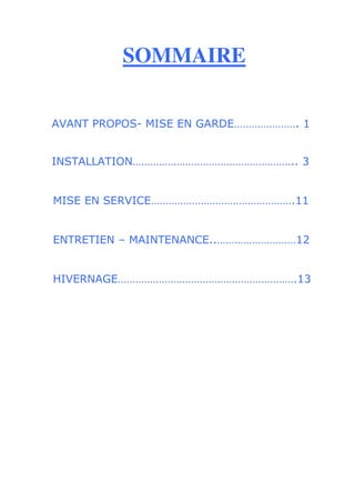 Ce document est un guide d'installation pour des kits de brumisation haute pression, détaillant les étapes d'installation, de mise en service et d'entretien nécessaires. Il souligne l'importance de respecter les normes de sécurité et fournit des instructions précises sur le matériel, les raccordements hydrauliques et électriques, ainsi que le réglage du système. Des mises en garde sur l'utilisation et l'entretien du matériel sont également incluses pour garantir la sécurité des utilisateurs.