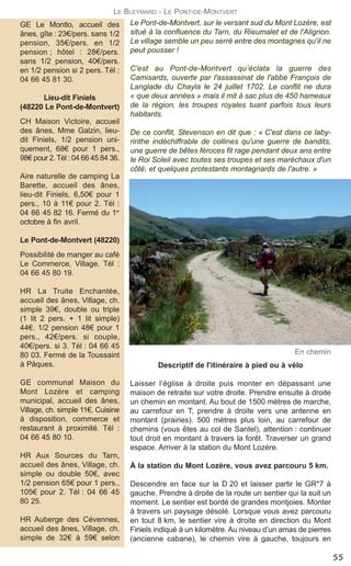 Le document décrit l'étape de randonnée entre Le Bleymard et Le Pont-de-Montvert, soulignant la longueur et le dénivelé de l'itinéraire, ainsi que des possibilités d'hébergement et de restauration le long du chemin. Il évoque également des événements historiques, notamment la guerre des camisards, qui a eu lieu dans la région, et fournit des indications sur les points d'intérêt à visiter. La vue depuis le sommet du Mont Finiels est présentée comme particulièrement magnifique.
