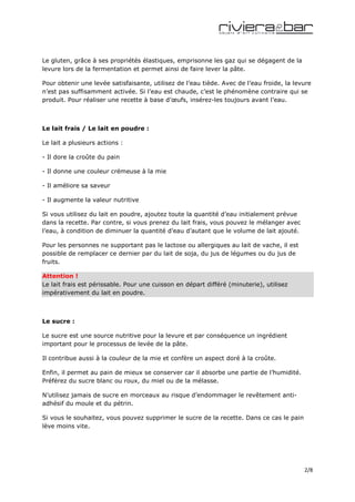 Ce guide détaille les ingrédients essentiels à l'élaboration du pain en machine, notamment la farine, les matières grasses, les œufs, l'eau, le lait, le sucre, le sel et la levure, en soulignant leur rôle spécifique. Il fournit également des conseils pratiques pour garantir la réussite du pain, tels que le respect des dosages, l'ordre de mise en place des ingrédients et l'importance de la fraîcheur des ingrédients. Enfin, le document aborde les modalités de fonctionnement et de sécurité de la machine, ainsi que des recommandations pour le pétrissage et le stockage du pain.