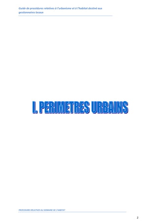 Le document est un guide sur les procédures d'urbanisme et d'habitat destiné aux gestionnaires locaux, détaillant la fixation et la modification des périmètres des communes urbaines et des centres délimités. Il décrit les étapes de l'initiative, de l'élaboration, de l'instruction et de l'approbation des projets, ainsi que les textes législatifs et circulaires applicables. Enfin, il souligne l'importance de ces démarches pour le contrôle des constructions et la gestion des ressources fiscales.