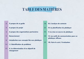 Le guide de plaidoyer, créé par l'association Jamaity et la fondation Cideal, vise à renforcer les capacités des coalitions pour promouvoir les droits humains en Tunisie en fournissant des outils pratiques pour des actions de plaidoyer efficaces. Ce document comprend des étapes clés telles que l'identification des problèmes, la définition d'objectifs, l'analyse de contexte et la mise en œuvre de stratégies de plaidoyer. Il souligne l'importance de la mobilisation et de l'éducation des citoyens pour influencer les politiques et garantir les droits fondamentaux.