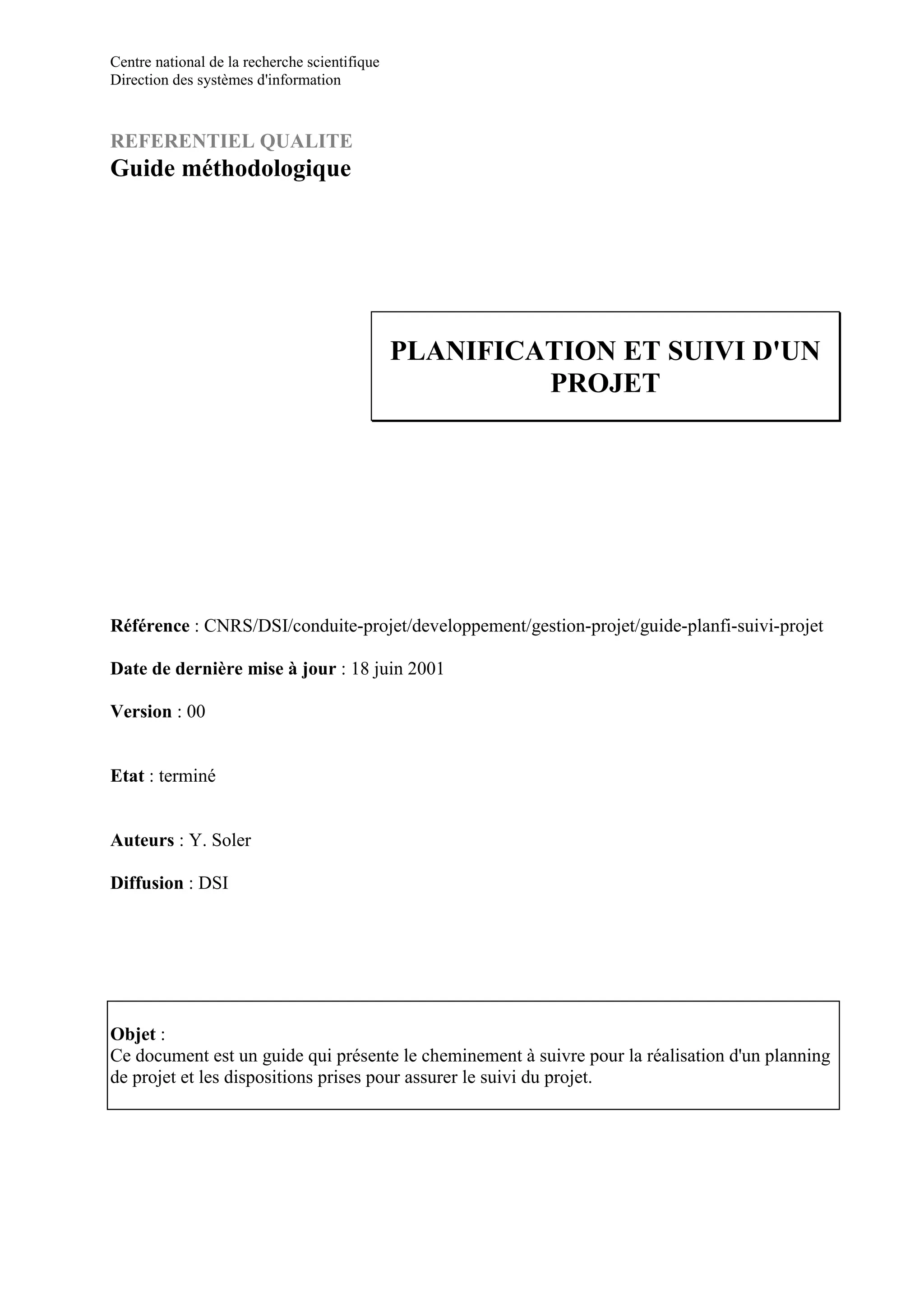 Ce document est un guide méthodologique pour la planification et le suivi de projets au sein du CNRS, décrivant les étapes nécessaires pour établir un planning et assurer un suivi efficace. Il aborde la définition des tâches, la coordination des actions, l'utilisation d'outils comme le diagramme de Gantt et les logiciels MS Project et Excel. Le guide inclut également des détails sur la tenue d'un journal de bord et des pratiques de communication entre les membres de l'équipe projet.