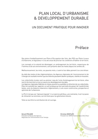 Le document présente un guide pratique sur la conception de plans locaux d'urbanisme (PLU) intégrant les principes du développement durable, promulgués par les lois Grenelle. Il souligne l'importance des collectivités locales dans l'aménagement du territoire et propose des outils concrets pour assurer une perspective durable et innovante. Enrichi de divers exemples et illustrations, ce document vise à transformer la planification urbaine en une véritable politique publique respectueuse de l'environnement.
