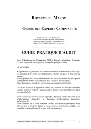 Le document présente un guide pratique d'audit approuvé par l'ordre des experts comptables du Maroc, visant à aider les professionnels à appliquer les normes de la profession d'expert-comptable. Il résume les étapes essentielles de la mission d'audit, en soulignant l'importance de l'évaluation des risques et de la conformité aux normes comptables en vigueur. Ce guide ne remplace pas le manuel des normes, mais constitue un mémo de référence pour les auditeurs.