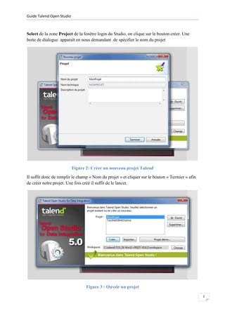 Ce guide présente les étapes de création d'un datamart utilisant Talend Open Studio, incluant la création de métadonnées, de jobs et le mapping entre les bases de données source et cible. Les utilisateurs apprennent à établir des connexions, créer des jobs pour la transformation des données et à utiliser le composant TMap pour réaliser le mapping. Enfin, des instructions sur l'exportation du projet Talend sont également fournies.