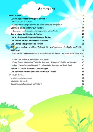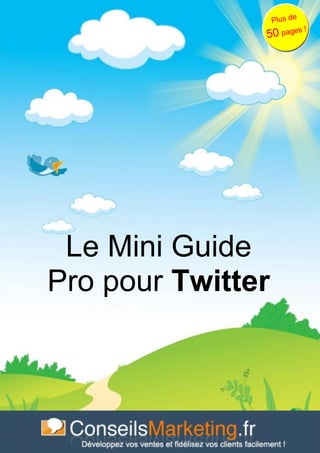 Ce guide pratique sur l'utilisation professionnelle de Twitter présente les meilleures pratiques et conseils pour les entreprises, incluant des méthodes de prospection, de veille concurrentielle et d'amélioration du référencement. Il met en avant l'importance d'envoyer des informations pertinentes et de construire des relations durables avec les utilisateurs. Le document offre également des ressources et des outils pour optimiser l'utilisation de Twitter, ainsi que les erreurs à éviter.