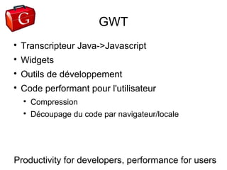 Le document présente des outils et techniques liés à la conversion de Java en JavaScript via Google Web Toolkit (GWT), en se concentrant sur l'optimisation du code et la performance des utilisateurs. Il aborde également des concepts comme les DTOs (Data Transfer Objects) et divers frameworks et bibliothèques pour la validation, la persistance et la gestion des logs. Enfin, il conclut sur l'importance des performances en développement sans DTO, tout en fournissant des liens vers des démonstrations et des ressources supplémentaires.