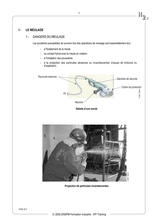 Le document traite des dangers et des précautions associés aux opérations de meulage et de soudage, en mettant l'accent sur les équipements de protection individuelle nécessaires pour assurer la sécurité des opérateurs. Il décrit également les responsabilités en matière d'entretien et de vérification du matériel ainsi que les mesures à prendre lors de travaux de soudage à l'arc électrique et oxy-acétylénique. Les risques potentiels incluent des brûlures, des intoxications et d'autres blessures corporelles.