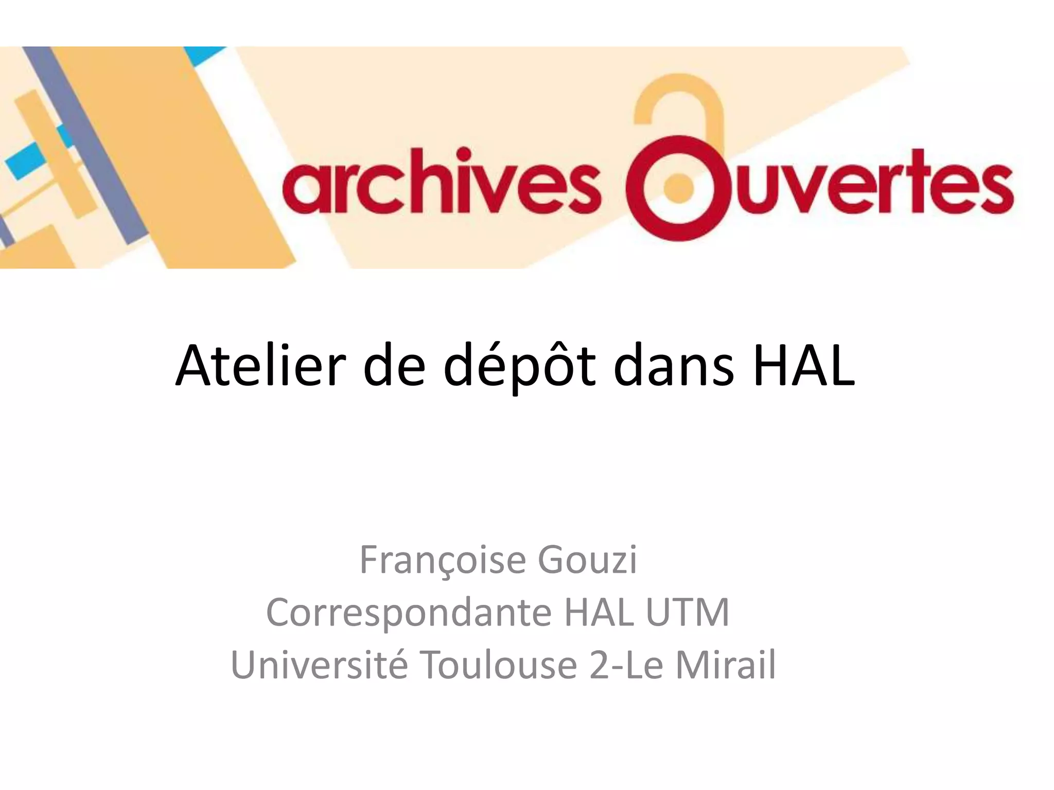 Le document présente un atelier sur les enjeux de la publication en libre accès, en abordant l'importance croissante des archives ouvertes face à la crise du système traditionnel d'abonnements. Il insiste sur le rôle des bibliothécaires et des établissements d'enseignement supérieur, tout en fournissant des statistiques pertinentes et des arguments en faveur du dépôt de publications en accès libre. Enfin, il décrit les étapes nécessaires au dépôt dans le système HAL, ainsi que les droits associés aux publications.