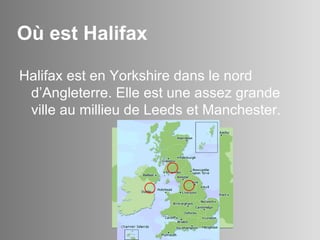 Halifax est une ville du Yorkshire, située entre Leeds et Manchester, connue pour son histoire dans l'industrie de la laine. Aujourd'hui, elle possède des lieux emblématiques comme 'The Piece Hall' et 'Wainhouse Tower', et se concentre sur des sports tels que le football et le rugby. Des activités sportives mineures comme le squash et le tennis sont également disponibles dans la ville.