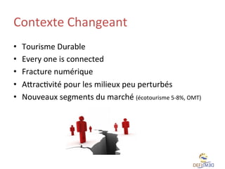 Le document présente les évolutions du secteur touristique, notamment l'importance accrue du tourisme durable et les défis liés à la fracture numérique en Tunisie. Il souligne l'impact des technologies de l'information et de la communication (TIC) sur les différentes phases du voyage des touristes. Enfin, le projet 'Take the Med' est évoqué comme une initiative visant à promouvoir le développement touristique responsable et à répondre aux besoins du marché.