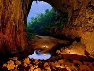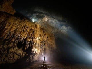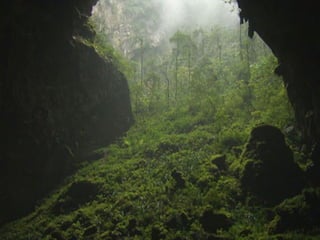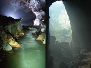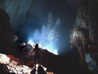 La grotte de Hang Son Doong, découverte au Vietnam en 1991 et explorée par des scientists en 2009, est considérée comme la plus grande grotte du monde, mesurant 5 km de long, 200 m de haut et 150 m de large. Elle abrite un écosystème unique avec des cascades pétrifiées, des sphères de pierres rares, et une nouvelle espèce de cloporte. La grotte présente des phénomènes géologiques intrigants, tels que des dolines formées par l'effondrement de son plafond, permettant la lumière du jour d'entrer et de créer des écosystèmes variés.