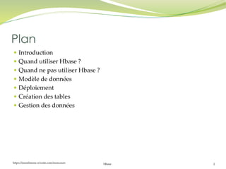 HBase est une base de données NoSQL orientée colonne conçue pour le stockage en temps réel de grandes quantités de données. Elle offre des fonctionnalités comme la scalabilité horizontale, une forte cohérence des données et s'intègre avec Hadoop. Le document présente également comment créer des tables, gérer les données, et effectuer des opérations CRUD avec HBase.