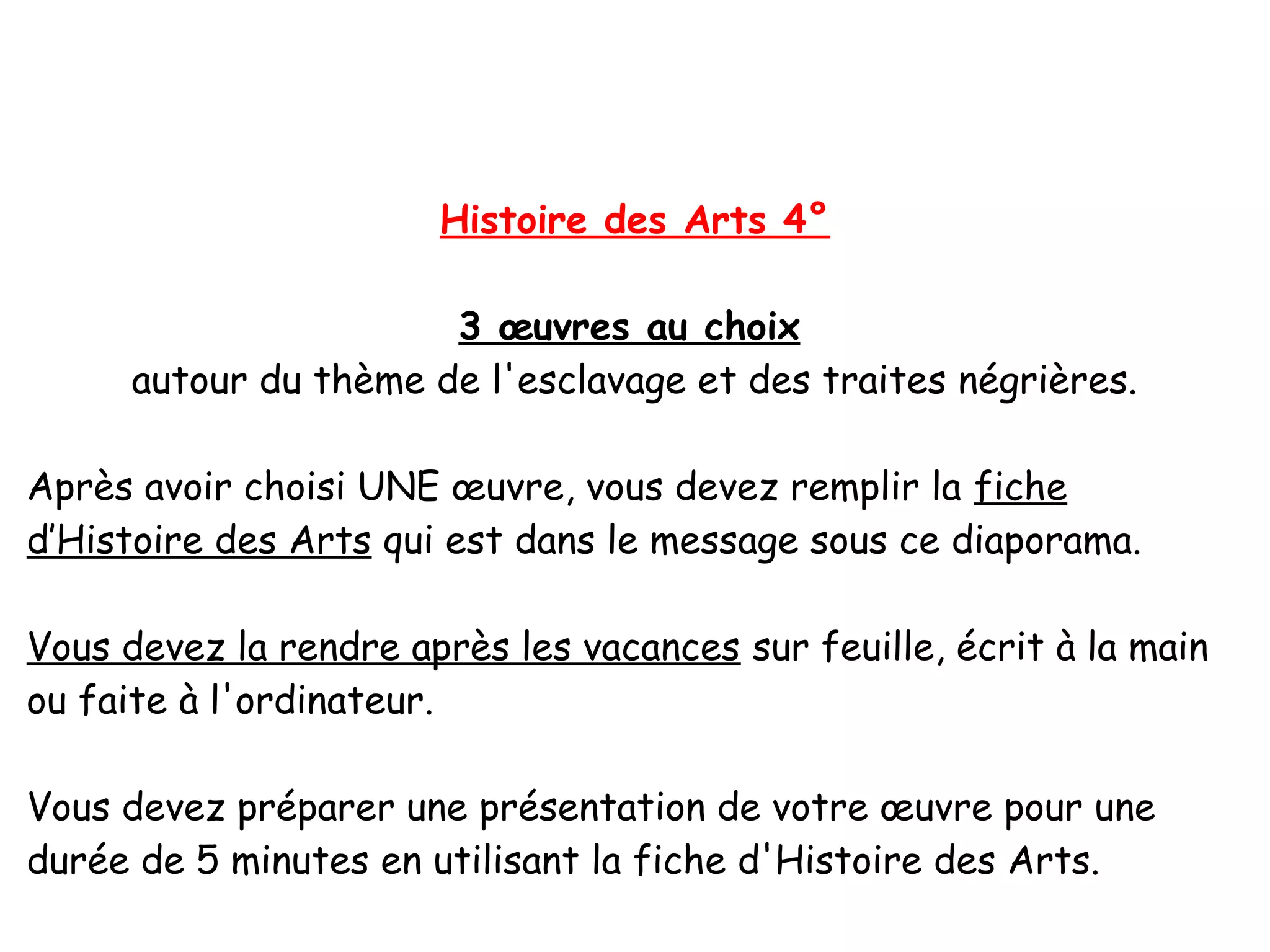 Les élèves de 4ème doivent choisir une œuvre sur le thème de l'esclavage pour remplir une fiche d'histoire des arts et préparer une présentation de 5 minutes. Trois œuvres au choix incluent un tableau de François Biard sur l'abolition de l'esclavage, une chanson gospel de Louis Armstrong, et le mémorial de l'esclavage à Anse Caffard en Martinique. Des liens utiles sont fournis pour aider à la recherche et à l'analyse des œuvres.