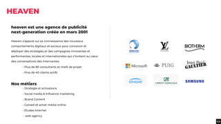 Heaven est une agence de publicité qui propose des formations certifiées basées sur ses expertises en marketing digital, incluant des modules sur le social media, l'influence marketing, le brand content et la gestion de la e-réputation. Les formations sont adaptées aux niveaux des participants et incluent des théories ainsi que des ateliers pratiques pour permettre l'acquisition de compétences opérationnelles. En plus d'un catalogue de formations, Heaven offre aussi des formations sur mesure pour répondre aux besoins spécifiques des clients.