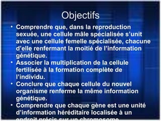 Le document traite de l'hérédité et de la reproduction sexuée, expliquant que chaque individu reçoit la moitié de son information génétique de ses parents via des cellules sexuelles. Les chromosomes, qui contiennent les gènes, jouent un rôle crucial dans la transmission des caractères héréditaires, définissant des traits communs et individuels. Il conclut que des anomalies génétiques peuvent entraîner des maladies, et évoque l'importance des généticiens dans l'étude des gènes.