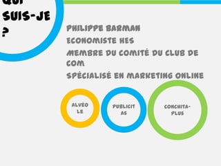 Le document présente une formation sur le référencement naturel dispensée par Philippe Barman, économiste et membre d'un club de communication, en décembre 2011. Il aborde le fonctionnement des moteurs de recherche, les critères de référencement, et les techniques d'optimisation pour améliorer la visibilité des sites web. Le texte évoque également l'importance du contenu de qualité, du choix des mots-clés, et des bonnes pratiques pour le référencement sur Internet.