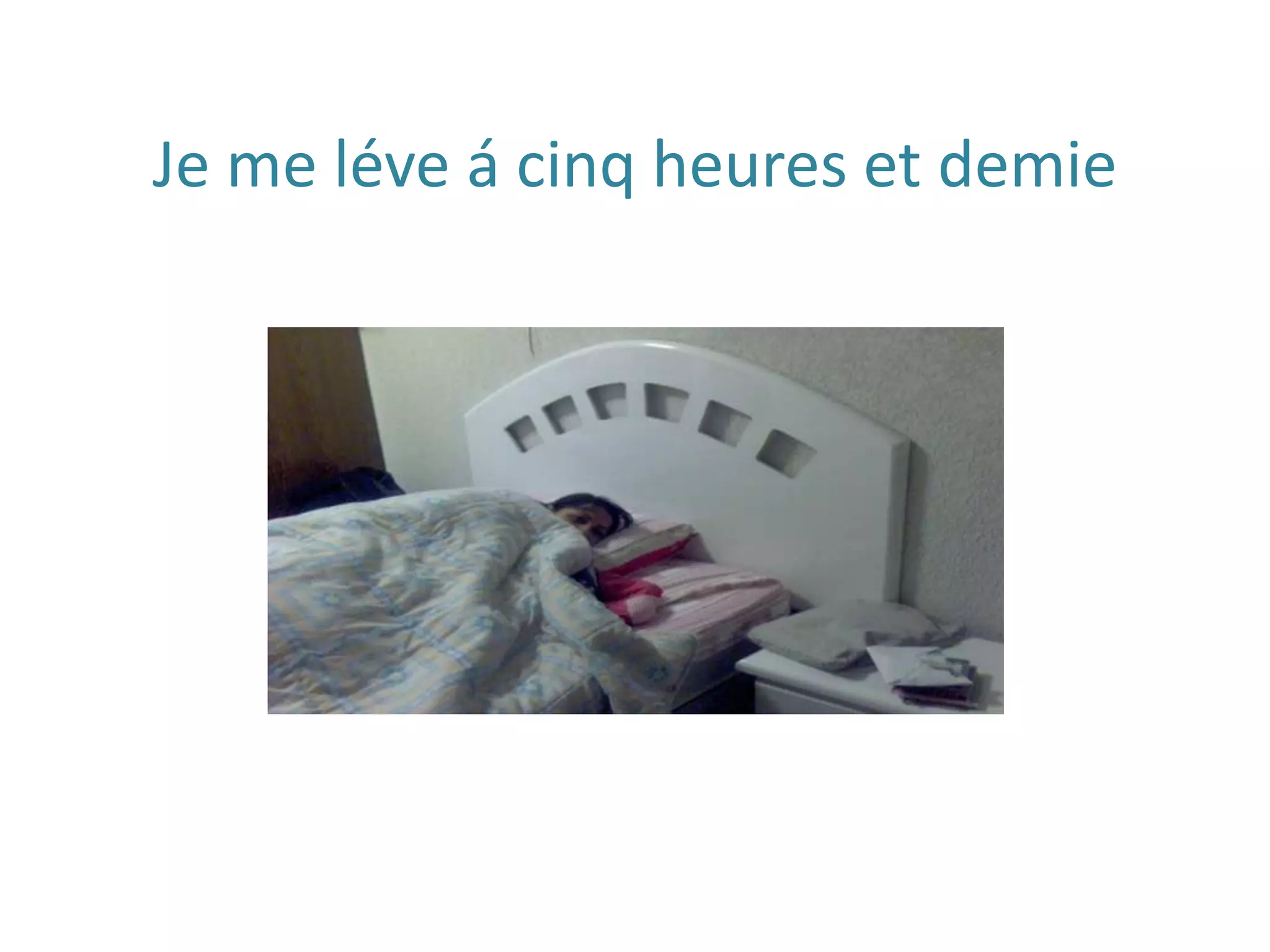 La personne décrit sa routine quotidienne, commençant par son réveil à cinq heures et demie jusqu'à son coucher à une heure du matin. Elle détaille ses activités telles que le travail, les repas et le temps de loisirs. Les horaires spécifiques sont mentionnés pour chaque activité.