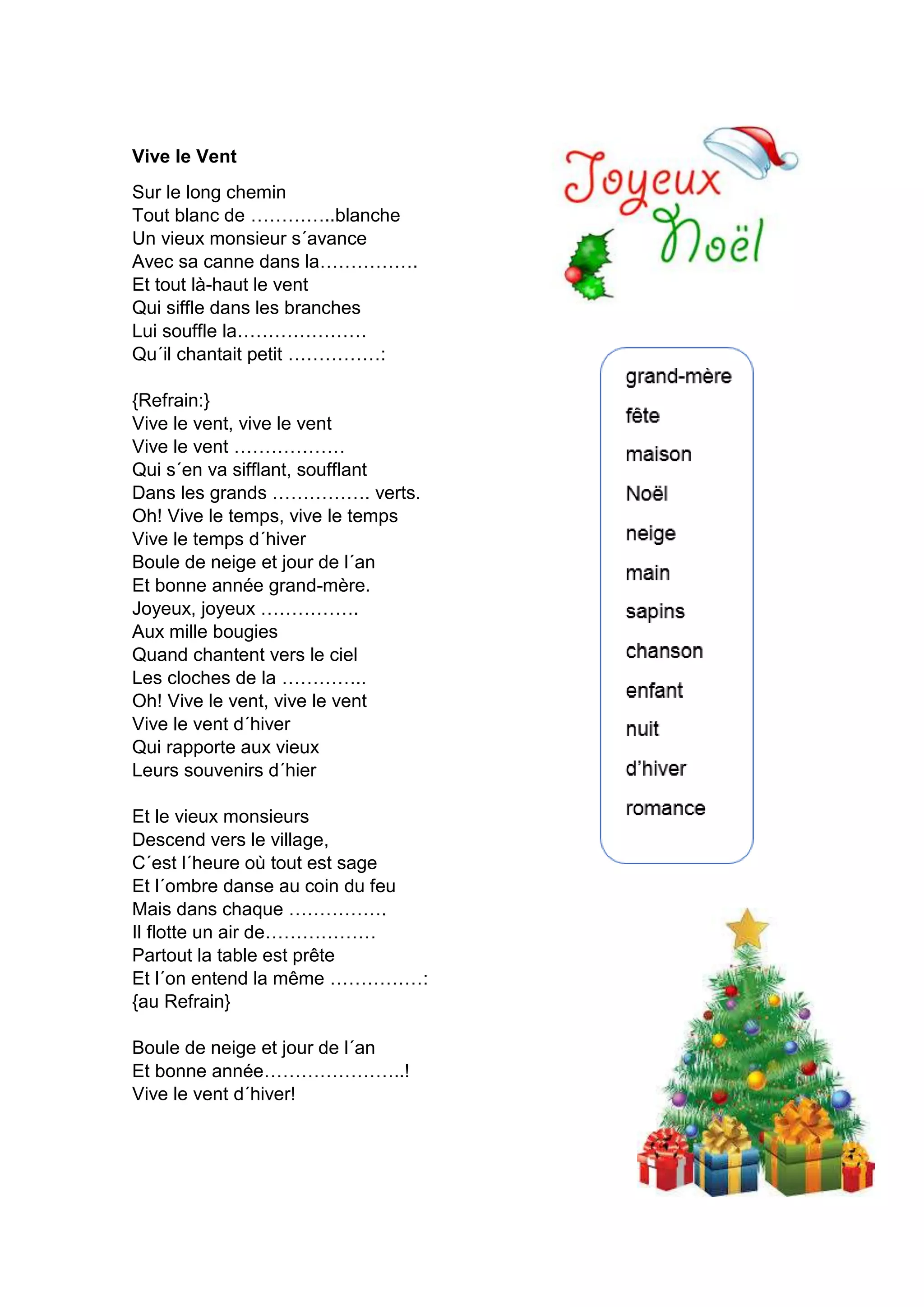 Le document évoque le vent d'hiver et ses souvenirs associés à Noël. Un vieux monsieur, avec sa canne, se rappelle des moments passés en chantant une chanson festive. La scène se déroule dans un village où l'ambiance est remplie de joie et de tradition.