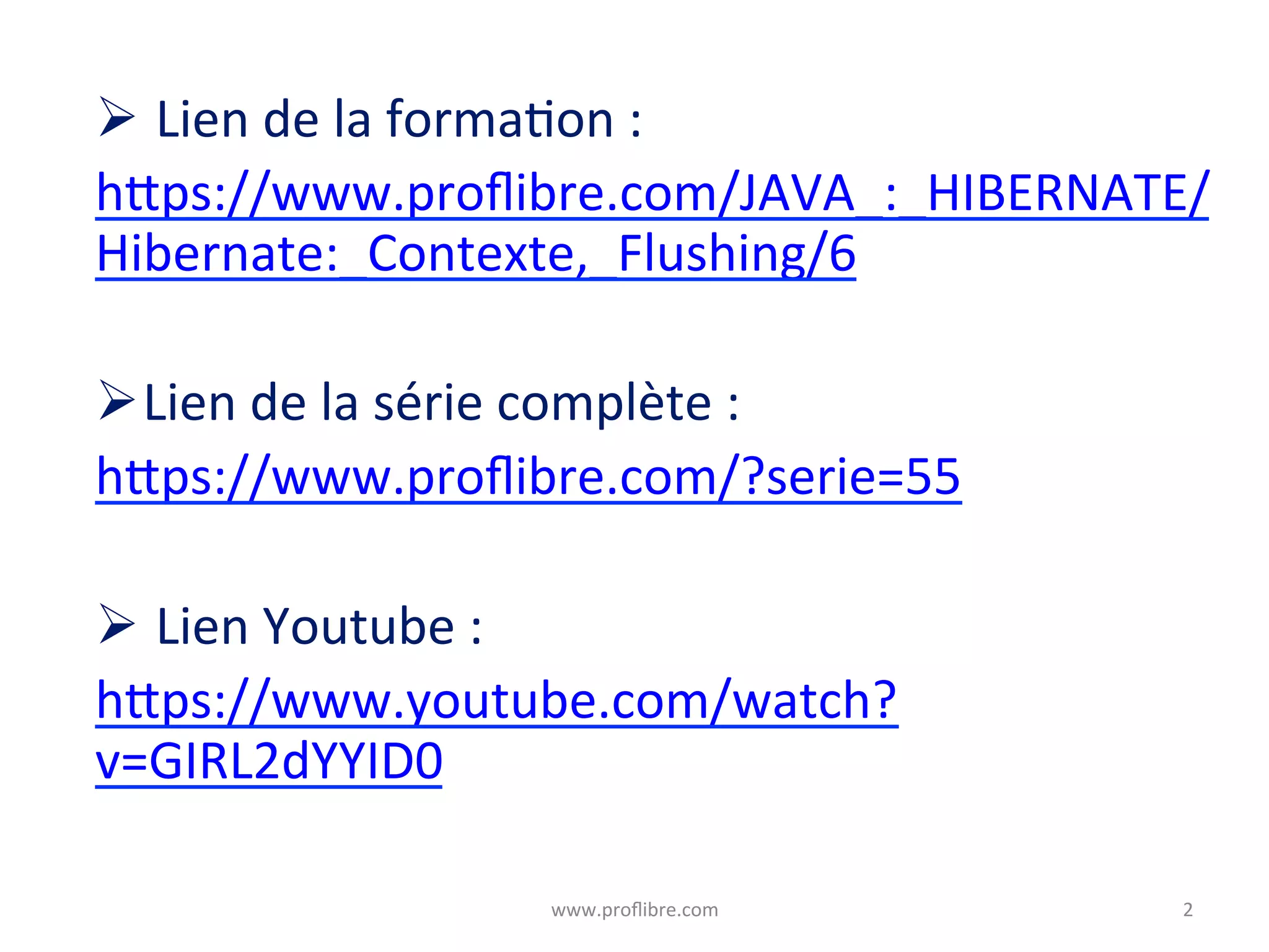 Ce document présente une formation sur le contexte de persistance et le flushing dans Hibernate, visant à enseigner les concepts fondamentaux relatifs à la gestion des entités. Il aborde les différents états d'une entité tout au long de son cycle de vie, ainsi que les options de flushing disponibles dans l'API native et JPA. Enfin, il se termine par une invitation à poser des questions et à explorer d'autres ressources pédagogiques.