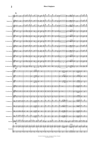 Le document semble être une partition musicale avec des indications pour différents instruments, y compris la flûte, le clarinette, et plusieurs types de saxophones, trompettes, et trombones. Il contient également des notations pour la percussion et des indications rythmiques. Le titre mentionné est 'Hino à Itapipoca', ce qui suggère qu'il s'agit d'un hymne lié à une localité spécifique.