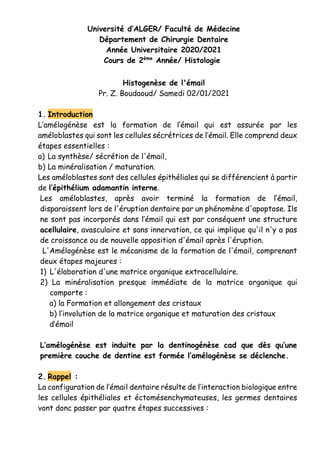 Le document traite de l'amélogénèse, le processus de formation de l'émail dentaire, réalisé par les améloblastes à travers deux étapes majeures : la synthèse de la matrice organique et la minéralisation. Il décrit également le développement embryologique de l'organe dentaire, ainsi que les phases de la cytodifférenciation des améloblastes en relation avec la dentinogénèse et les facteurs influençant l'émail. Enfin, il présente la chronologie de l'apparition et de la minéralisation des différentes dents temporaires et permanentes.