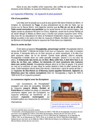 L'histoire du Bénin se divise en quatre grandes périodes : les royaumes du XVIe siècle à 1894, la colonisation française entre 1894 et 1972, la dictature marxiste-léniniste de 1972 à 1990, et la démocratie établie depuis 1990 malgré de nombreux défis. Le royaume d'Abomey, puissant dans le commerce négrier, finit par céder face aux forces françaises, entraînant une colonisation qui marginalise les anciens monarques. Après une période de troubles et de résistance, le Bénin accède à l'indépendance, intégrant des éléments de démocratie tout en luttant contre la corruption.