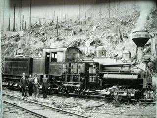 Le document traite des exploitations forestières autour de Seattle vers 1900, en mettant l'accent sur l'utilisation de locomotives à engrenages pour relier les zones de travail. Les locomotives, telles que la Shay et la Climax, étaient adaptées pour des rayons de courbure serrés et présentaient un design dissymétrique. Des photos prises par Darius Kinsey illustrent l'état du terrain laissé par les forestiers et les infrastructures, comme les ponts construits au cours de cette époque.