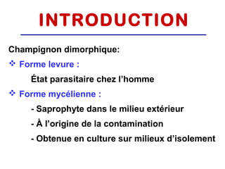 L'histoplasmose est une mycose causée par le champignon dimorphique Histoplasma capsulatum, se présentant sous deux variétés : capsulatum (américaine) et duboisii (africaine). Les infections peuvent être asymptomatiques ou entraîner des atteintes pulmonaires et viscérales, et le diagnostic repose sur des examens mycologiques, anatomopathologiques et immunologiques. Le traitement varie selon la gravité et peut inclure l'itraconazole ou l'amphotéricine B, surtout chez les patients immunodéprimés.