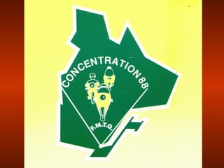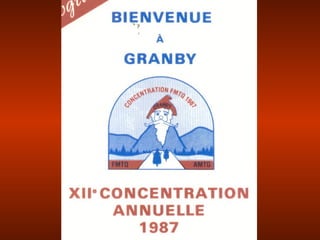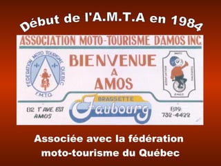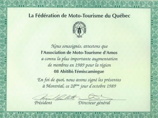 Le document décrit diverses activités et événements organisés par la fédération moto-tourisme du Québec, notamment des bénédictions de motos, des parades, et des compétitions. Il souligne également des reconnaissances pour des mototouristes de l'année et le lancement d'un nouveau logo pour l'association. La période couverte s'étend de 1984 à 2004, marquant des anniversaires et des changements d'affiliation au fil des ans.